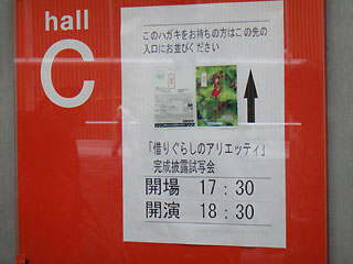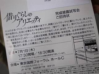 2010年7月1日、スタジオジブリの最新作「借りぐらしのアリエッティ」の完成披露試写会が東京・有楽町の東京国際フォーラムで行われた。これまでのジブリ作品の完成披露では、記者会見が完成披露試写会に先立って行われていたが、今回の記者会見は特に設定されなかった。(代わりに、東京・芝の増上寺で関係者によるヒット祈願が行われ、これを取材した模様が翌日の新聞記事等で報道された。)