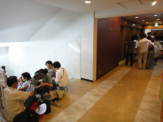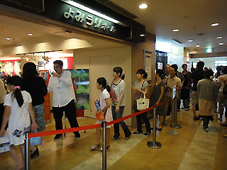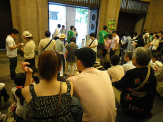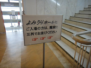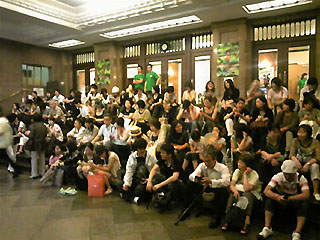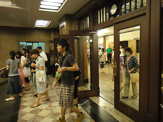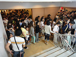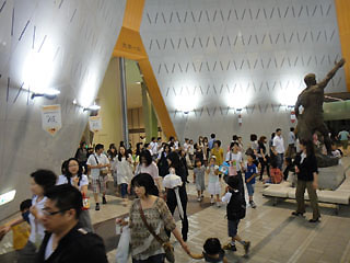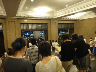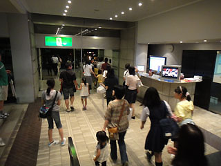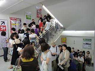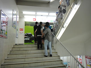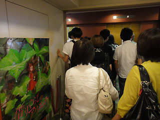 ![]() 下りエレベーターを待つ観客と次回待ちの行列 |