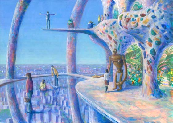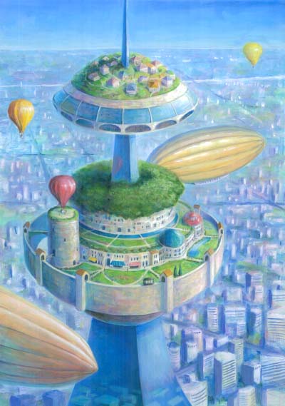 「ラピュタワー」の下部構造は透明度&反射係数の高い素材が用いられ、太陽光線の透過と周辺風景の反射が適度にバランスし、遠方から見た場合「上部構造物があたかも空中に浮かんでいる」かのようなフォルムを実現した。そして、上部構造物には樹木がふんだんに植えられ、文字通りの「空に浮かぶ空中庭園」が出現することになった。高層建築といえば無機質の大きなビルがにょきにょきと建つだけというのが定番であったが、樹木に覆われた空中庭園は、それ自体が革命的な環境融和型の都市計画を牽引する。もちろん、地域のエネルギー効率を最大に生かすためのハイテクが満載。風力、太陽エネルギーは当然として、周辺の緑化によるバイオマス・エネルギーも活用して、エネルギーの自給率を限りなく100%に近づけるような工夫が施されているという。