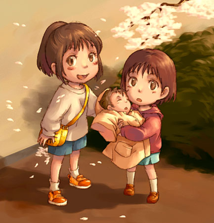 宗介くん(0)を抱く雫ちゃん(3)と千尋ちゃん(5)。