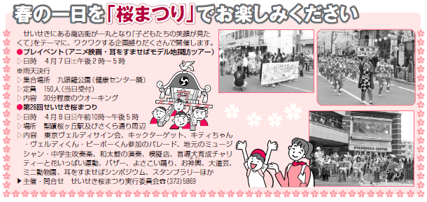 2007年春、せいせき桜まつりの中に「耳をすませばモデル地探訪ツアー」という企画が組み込まれ、ガイドが聖蹟桜ヶ丘〜丘の上のコースを案内して回ることになったという。さらに、「耳をすませばシンポジウム」という企画も組み込まれ、「耳をすませばにちなんだ町づくりは可能か?」というテーマで話し合われたりすることになったという。例えば、天沢聖司の銅像。「まちづくり」の一環として銅像を建てるのはどうよ?」などということが議論されるのだろうか??