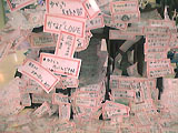 工夫といえば、ウチワや段ボール、果ては野球ボール、棒きれ、生のジャガイモといった立体物に切手を貼ってよこす曲者もいる。なかなか意表をつく応募で楽しませてくれるのだが、残念ながらそれらは真っ先に抽選対象から外される。一応、抽選は関係者立ち会いのもと厳正に行われることになっているから、オーソドックスなハガキで応募しないと抽選の束の中に入れてもらえない。