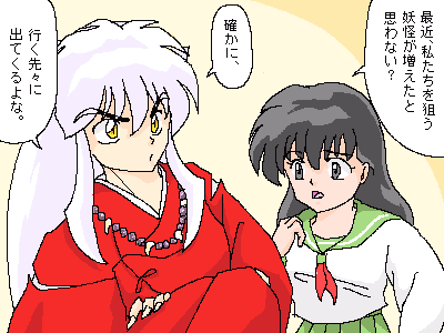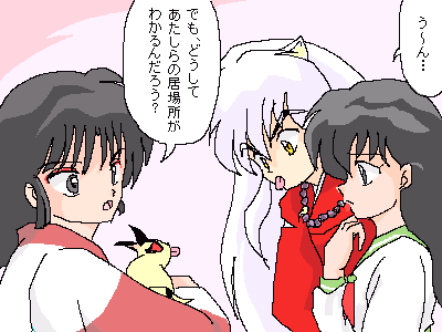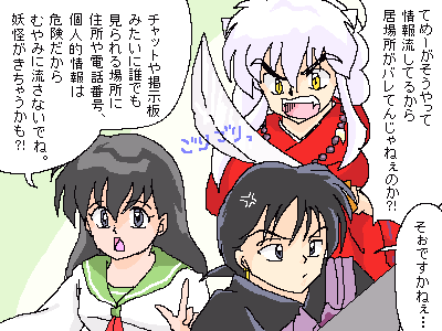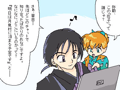 ★今回のお話は、どうして犬夜叉達の行く先々に妖怪が待ち伏せしていたのかを考えました。その原因は、弥勒がチャットに「明日は月見村に泊まる予定です。」とカキコしたことにありました。チャットは世界中の人が見ることが出来ますから、四魂の玉を狙う妖怪だって見ているかもしれません。もし、妖怪がこのカキコを見たら、「しめしめ、月見村に先回りして弥勒達から四魂の玉を奪ってやろう。」と考えたって不思議ではないですよね。だから、犬夜叉達は行く先々で妖怪の待ち伏せ攻撃に遭うハメになってしまったのです。その妖怪は、たまたま弥勒と花子とのチャットを見ていて知ったのかもしれませんし、「花子」そのものが妖怪だったのかもしれません。