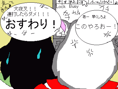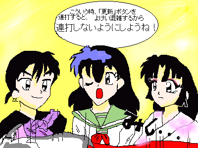 ★「犬夜叉」のTVシリーズが始まって以来、アクセス数の増加に伴って掲示板・チャットの混雑が目立つようになってきました。特に、夕方から夜間にかけてチャットやお絵かき掲示板に CGI Execute BUSY!! または Lock BUSY というBUSY表示(エラー)の出ることが多くなっています。