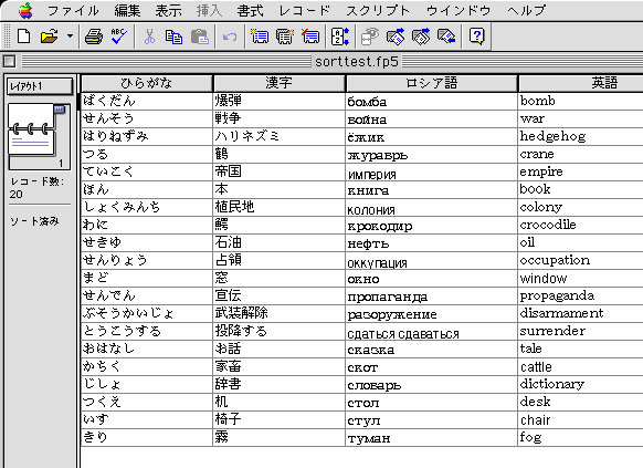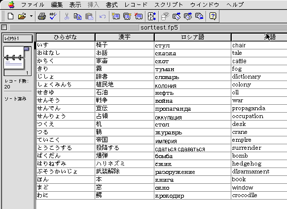 MacのOS 9.2で、FileMaker6.0でロシア語ソートができるかどうか試してみました。これまで通りソートができました。ソート画面例は以下の通りです。