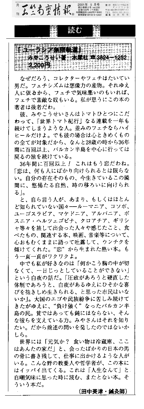 | 「ユーラシア無限軌道」概要 | 木犀社(もくせいしゃ)書評 河北新報 岩手日報 北海道新聞 月刊天竺南蛮情報 | |