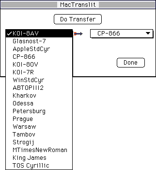 - MacTranslit2.1.1 Mikhail Friedbergさん(fridberg@pfc.mit.edu)のシェアウエア。多様なテーブルあり。Wordファイルで書きだします。操作画面の様子