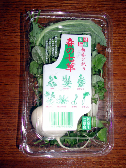 | Семь весенних трав могут варьироваться в зависимости от местности. Как правило это сэри (японская петрушка), надзуна (пастушья сумка), гоге (сушеница), хакобера (мокрица), хотоке-но-дза (яснотка), судзуна (японская репа), судзусиро(японский редис) | 七草は、場所によってことなっています。