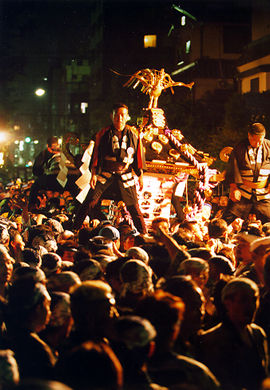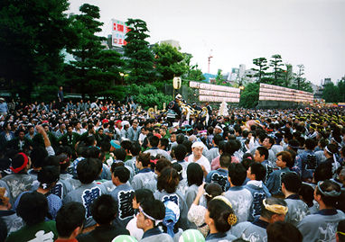 | Я однажды принимал участие в этом празднике, так как один из моих друзей жил в этом районе. На собрании микрорайона (тёкай) были розданы хатимаки (повязки на голову) и официальная униформа каждого микрорайона. В хатимаки и форменной одежде мы должны были нести на плечах храм. | 友人が住んでいたので、一度この祭りに参加したことがあります。町会が、正式な鉢巻きと法被を配ります。その鉢巻きと、法被を着た人が、神輿を担ぐことができるのです。 | I once participated in the festival because one of my friends lived there. Chokai or local meeting distributed hachimaki and lent the official uniform of each section of the town. With hachimaki and the uniform, we are entitled to shoulder the shrine. |