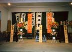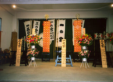 | Есть два типа храмов. Один тип принадлежит синтоистскому храму Асакуса Дзиндзя. Таких храмов три: Итино-мия, Нино-мия и Санно-мия (первый, второй и третий храм). Похоже, что нет особых правил относительно того, кто несет эти наиболее важные храмы. Поэтому утром первого дня происходит что-то вроде боя за то, чтобы занять позицию возле каждого из храмов. | 神輿には二種類あります。一種類は、浅草神社の神輿です。これは三つあります。一の宮、二の宮、三の宮です。つまり、第一の神社、第二の神社、第三の神社です。これらの大事な神輿を誰が担ぐかという明確な基準はないようです。それで、朝には神輿を担ぐための争いがおこります。 | There are two categories of portable shrines. Shrines of one category belongs to the Asakusa Jinja Shintoist shrine. There are three of them. Ichino miya, Nino miya, and San no miya.First shrine, second shrine and the third shrine.It seems there are no rules as to who will carry these most important shrines. Therefore in the first morning there is a kind of fist fighting to get a position at each shrine. |