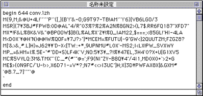 相手は、このASCIIコードを、uudecode、つまりもとのファイルに復元して、KOI8文字を指定すれば、問題なく原文が読めるというわけです。相手はMacでも、Windowsでも構いません。機種にあったuudecodeソフトを使って復元しさえすればよいのです。