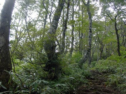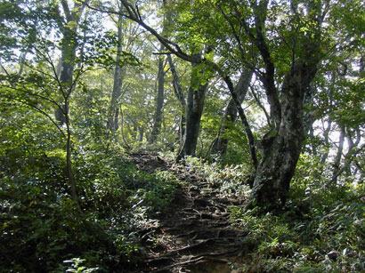 シャクナゲ平の手前で木の階段が続く。この辺りの標高では大きなブナが少なくなった。