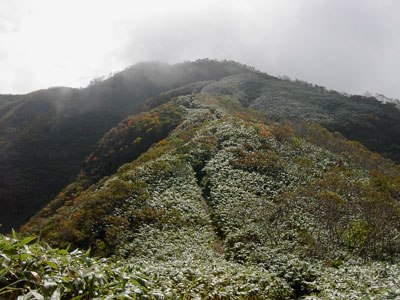 白い幕の中。ササの中を急登する。道脇で鈍くゴソゴソと音がした。アオダイショウのような