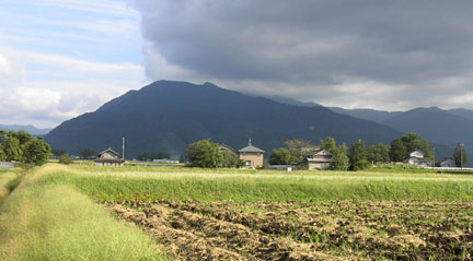 その奥の山には灰色の雲がかかっているが昼には晴れるだろう。