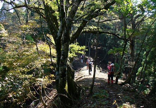 南の方へ尾根を辿る。良く掘れた古い道である。「ばん」取り跡や「水飲み場」を過ぎて大段谷山からの