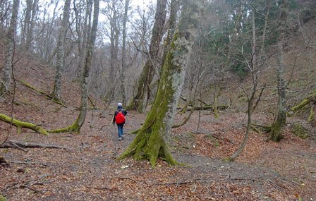 広がった。落ち葉の中に踏み跡が続いている。何度か沢を渡る。苔むした幹のブナ。
