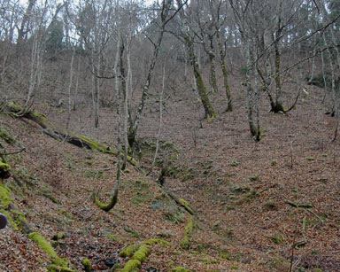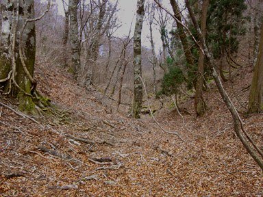 落ち葉だけに覆われた谷が両側に下りていく鞍部になっている。ここから急坂を