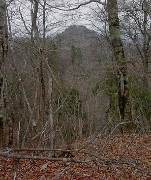 若狭の急な斜面。三角点の岩より一回り小さい標石がある所が永谷山への尾根