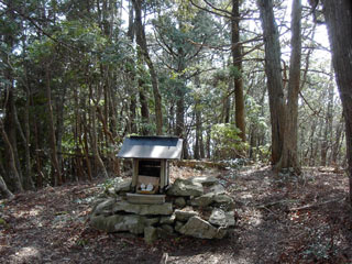 愛宕山。その間は急坂の鞍部。岩があちこちと顔出す斜面を幹につかまり登ると小さな祠のある
