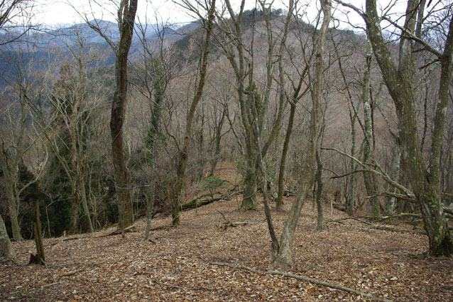 空山の尾根筋、鉢伏山まで欲しいまま。さらに尾根を西に歩けば落ち葉の冬枯れが続く。
