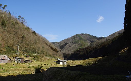 静かな山間に畑仕事の人がひとり。この谷は林道がふた筋遡っている。山側にはずっと柵が張ってある。