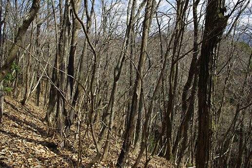 谷を登っていと斜面の上の方から明るい雑木林が誘う。汗が出てくる。林道がいつの間にか細くなって