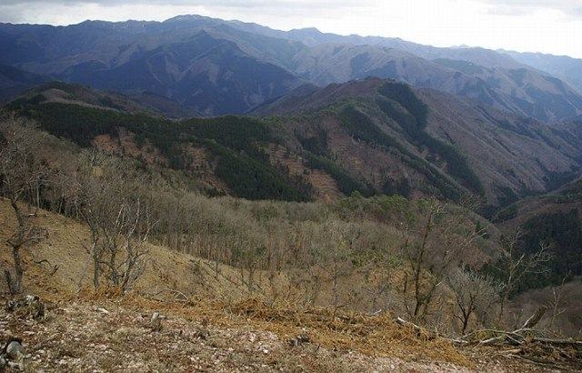 植林から雑木林になって岩が出てくる。落ち葉敷きつめたピークに着く。黄色いプラ杭があった。木々は多いが