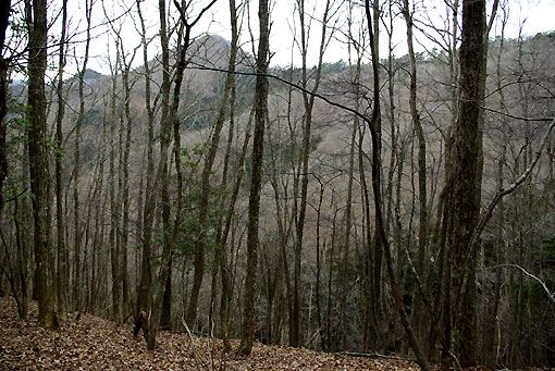 谷は北へ曲がっていき、向かいの西側の斜面は素晴らしいほどの全面冬枯れ。ワクワクしてくる。