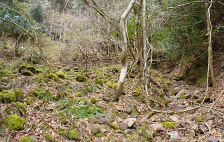 やがて荒れた石ころの広場の先に竹林。崩れた祠がある。