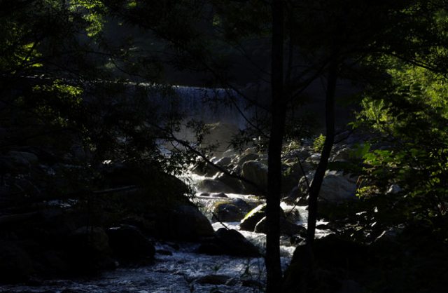 いよいよ山道になるが、沢沿いの緩やかな道が続く。鉄の橋を渡ると斜に入る朝日で沢の水しぶきが輝く。