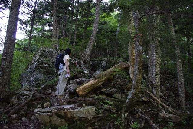 赤や黄のテープに従いつづら折れを登っていく。クサリ場、ロープ場があるが初めのうちで、