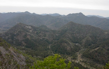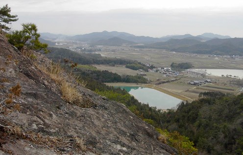 松まじりの低木、面白いように高度が上がっていく。まわりの山や田畑が広がった。