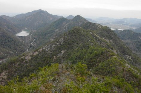 今から歩く尾根、すぐ北に横たう笠松山の尾根、山にはさまれた池(大柳ダム湖)。低山なれど壮観。