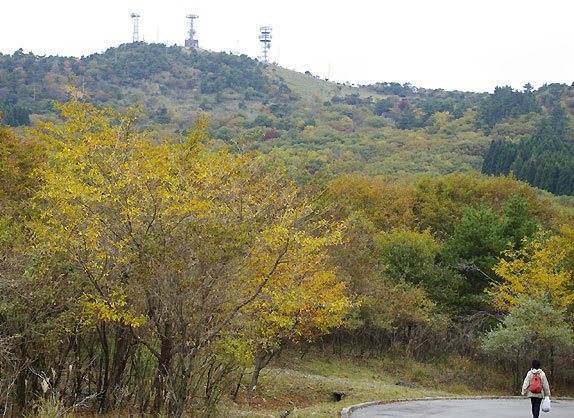 ホテルの前から左の車止めのある舗装道に入る。くねくねと曲がった道の脇には半分ほど色づいたモミジや