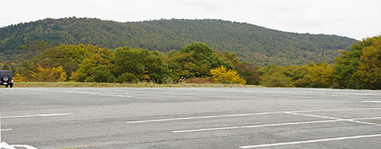 山間に入ってだんだん寂しくなっていく。県道右手に高原の看板。右折しさらに上って広い駐車場が現れる。
