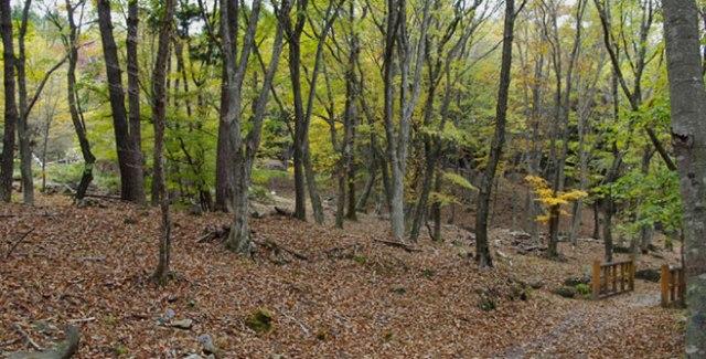 黄色いクヌギなどの林がある。グランドの横から北へハイキングコースがあるが今日はパス。