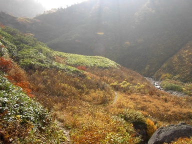 【ガスの赤谷に陽射し】 2年前の秋に素晴らしい紅葉を見て、今年も期待して来たのだが
