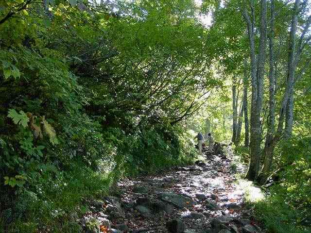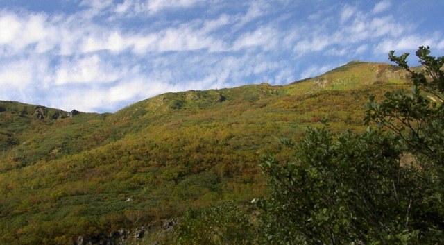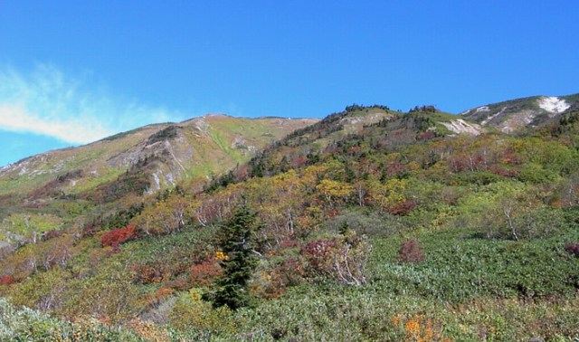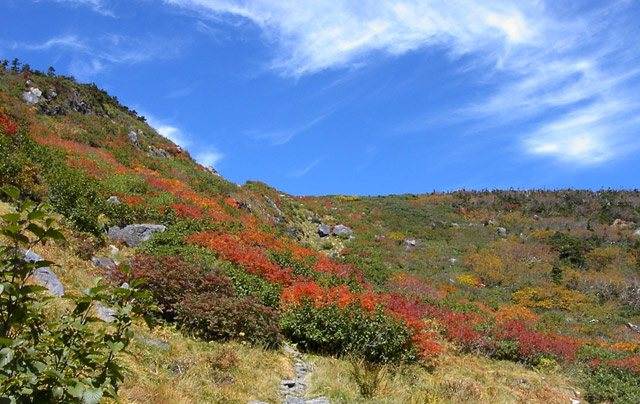南竜道を東へ向かうとナナカマドの紅葉がちらほらと出てくる。南竜荘辺りはササが多くて彩りは少ない。