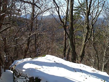 【眺め】 前方は葉の落ちた雑木林越しに剣尾山や横尾山の山影が新鮮。特にここから見る横尾山