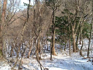 ここは私以外に新たに山頂ですれ違った先客二人と思われる足跡がついている。植林手前の雑木林