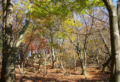 落ち葉が良いなぁと見下ろす林の斜面を進むと655mピーク南西辺り。ここからの道は