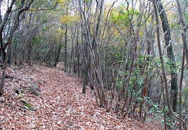 南のかわいい小尾根を辿ってハイク道に合流。落ち葉だらけのいい林です。井手分岐の