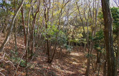 この後先ともピークを巻く道である。北には盆地の景色が見えそうで枝がじゃまする。