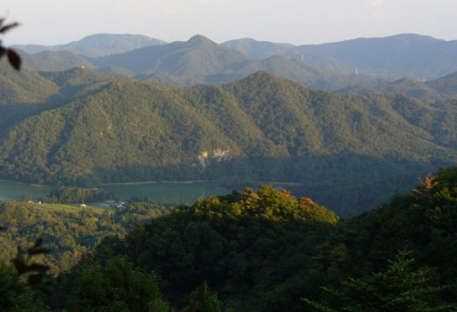 来た道を下りていく。巻き道からの展望は、登りの時からさらに日が傾いてほのぼのとした里山が