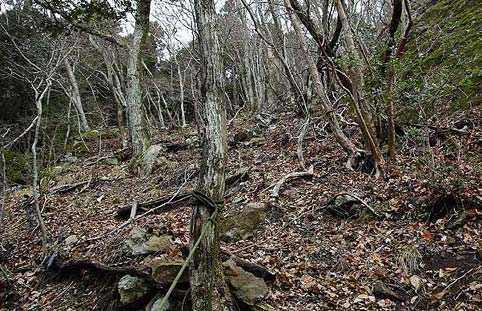 短い檜林を登った先には、文字が消えて判読できない道標とロープがあった。まだ、ロープに頼るほどではない落ち葉の