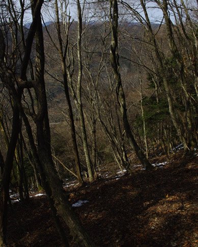 北は葉の落ちた雑木越しに白尾山への尾根だろうか。
