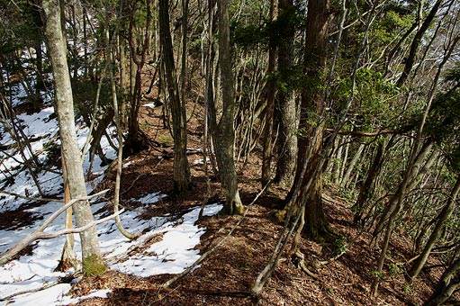 ある実感が湧く。ただし、その標識の先は雑木の斜面で踏み跡はよくわからない。下草はないので歩くのに苦はない。
