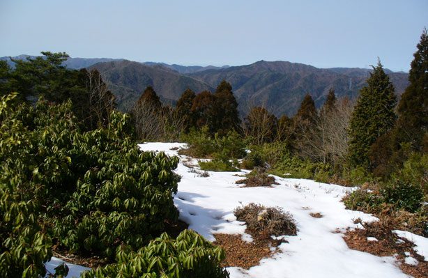 ホサビ山の南西以外は山並みが見渡せる。若狭に連なる山は南面ながらまだ雪を被っている。