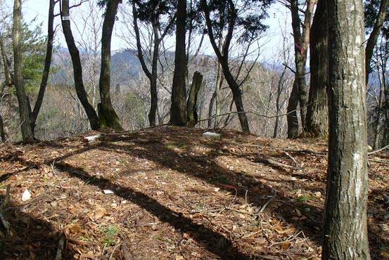 緩やかな尾根は再び急登となる。立木を捕まりながらの登りが続く。たまに残置テープがある。左手に堀が現れて来た。
