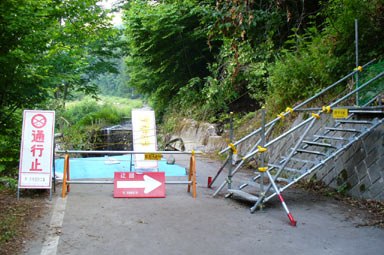 2ヶ所ほど路肩の崩落ヶ所があり、これ位だったら通れるのではと思ったが、さらに行くと完全に